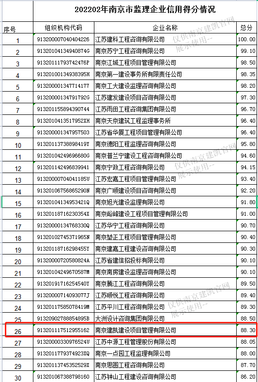 我司监理企业在2022年下半年南京市建设工程监理企业信用评价综合得分88.30分
