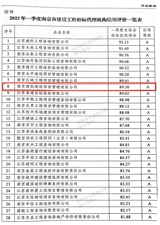 热烈祝贺我司招标代理机构在2023年第一季度南京市建设工程招标代理机构信用评价综合得分89.30分,全市排名第八名