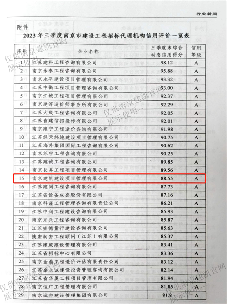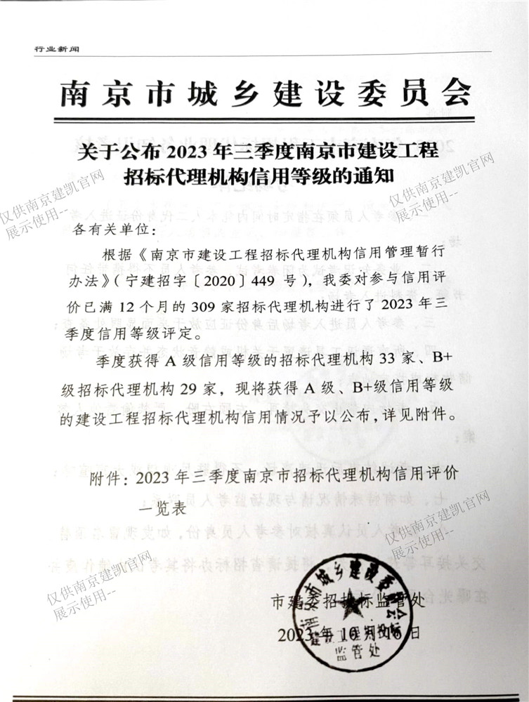 热烈祝贺我司招标代理机构在“2023年三季度南京市建设工程招标代理机构信用评价等级A”