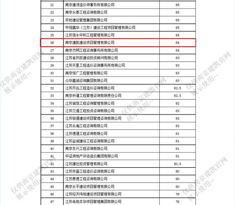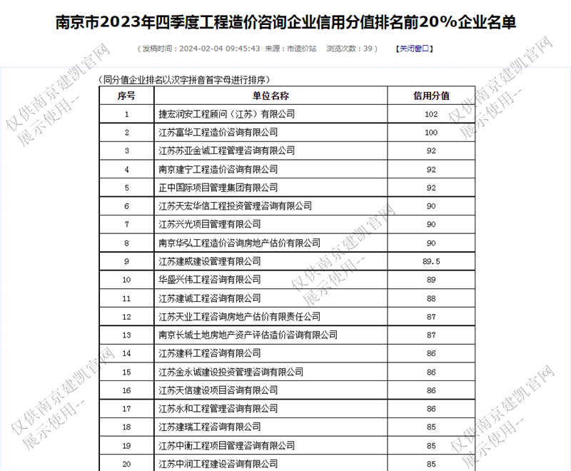 恭喜我司入选“南京市2023年四季度工程造价咨询企业信用分值排名前20%企业名单”