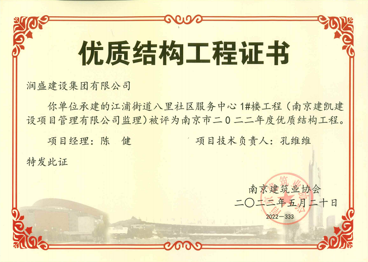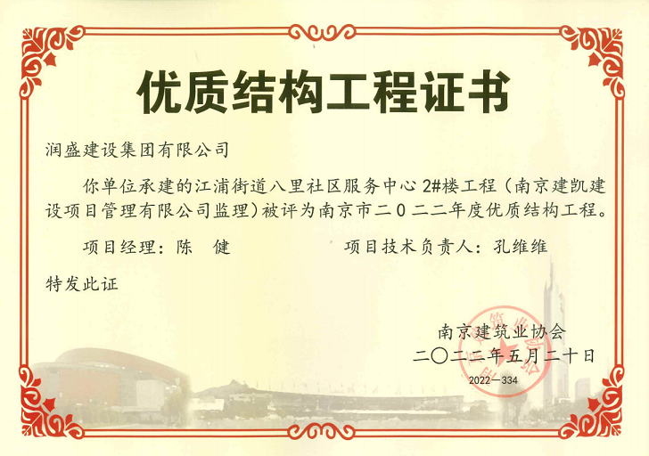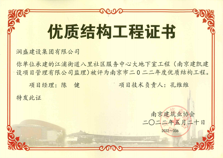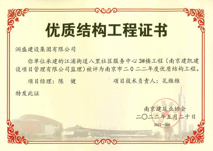 (2022年05月20日)江浦街道八里社区服务中心项目荣获《南京市2022年度优质结构工程》