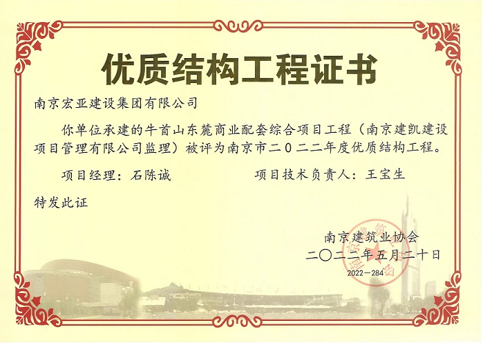 (2022年05月20日)牛首山东麓商业配套综合项目荣获《南京市2022年度优质结构工程》