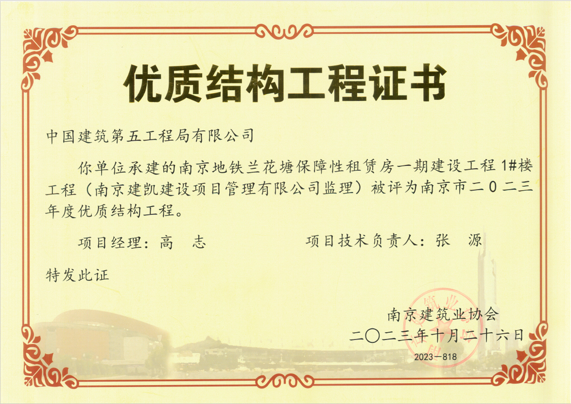 南京地铁兰花塘保障性租赁房一期建设工程 1#楼工程荣获“优质结构工程证书”